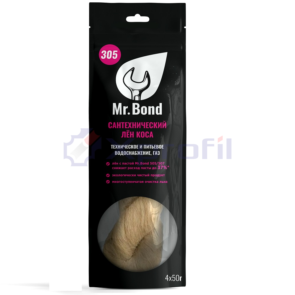 Лен сантехнический коса Mr.Bond® 305. Представляет собой чистый натуральныйпродукт, изготовленный из тонкого, однородного, длинноволокнистого, чёсаного льна,получаемого из стебля льна. Изготовлен по ГОСТ Р 53549-2009. Лён является органическим материалом, подверженным гниению при контакте с влагой и воздухом, поэтому его следует пропитывать специальными средствами. Тонко-чёсанный сантехнический лён вместе с уплотняющими пастами Mr.Bond® 505/507, используются для уплотнения резьбовых соединений в трубопроводах различного назначения.Сантехнический лен является 100% натуральным продуктом, поэтому в процессе эксплуатации не выделяет токсичных и вредных веществ. Лён сантехнический применяется в сантехническом производстве: набивка сальниковых муфт, уплотнение чугунных и керамических труб с раструбом, подходит для любого вида соединений.